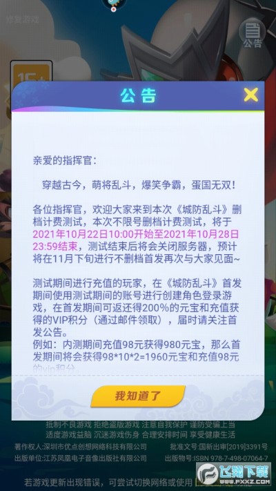 测试期间进行充值的玩家,在《城防乱斗》首发期间使用测试期间的账号进行创建角色登录游戏,在首发期间可返还得200%的元宝和充值获得的VIP积分(通过邮件领取),届时请关注首发公告。例如:内测期间充值98元获得980元宝,那么首发期间将会获得98*10*2=1960元宝和充值98元的vip积分。