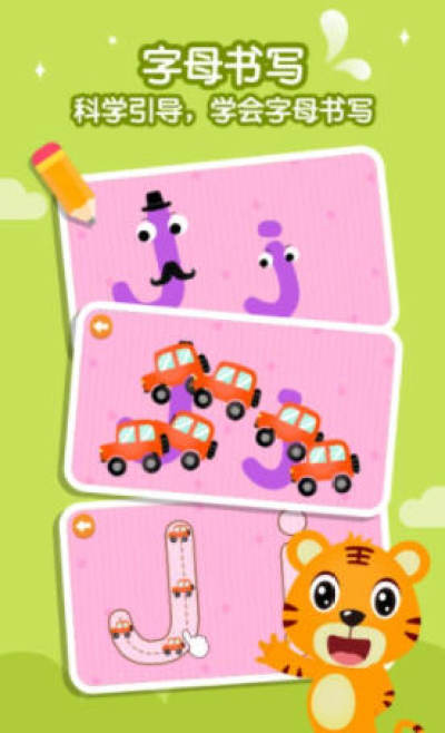 3.字母描红,配合趣味动画,让孩子在玩耍中掌握字母书写笔画。