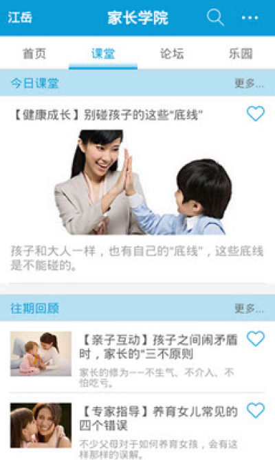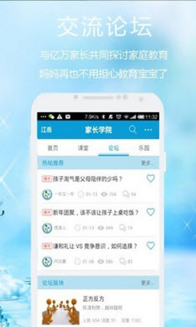 2、家长学院的论坛设置了正方反方、答疑解惑、孩子心语、爸妈共亲职四大版块,教育孩子的过程中遇到任何问题,您都可以在这里与百万家长一通商讨,寻求帮助;
