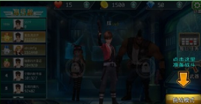 主界面左方显示为排行榜,界面邮费显示为挑战模式和闯关模式,点击进入!