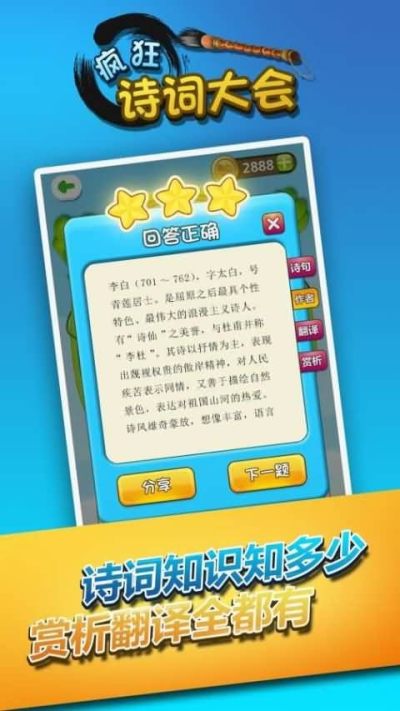 3、关卡内的题库包含了小初高所有的诗词,还有教材外700首有名的诗词。