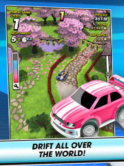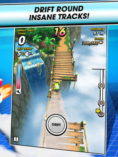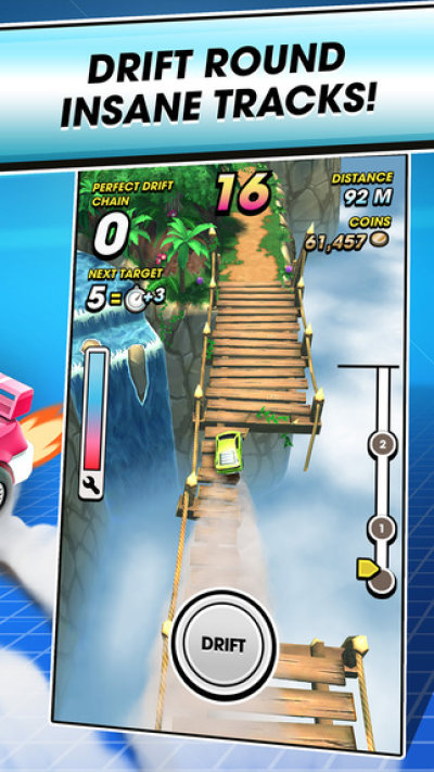 在《超级漂移》中,玩家将有机会驾驶各种酷炫车型(重卡、豪华跑车等)在水泥路、沙土路、石头路等不同跑道上自由狂飙。然而这不是一款纯竞速游戏,因为有很多个弯道在等待着玩家以优美的姿态漂移过去。另外路上还有很多金币等待玩家收集,还有陷阱要注意避开。所以《超级漂移》看起来简单,但是如果反映及操作不够快速,那么是很容易失败的。