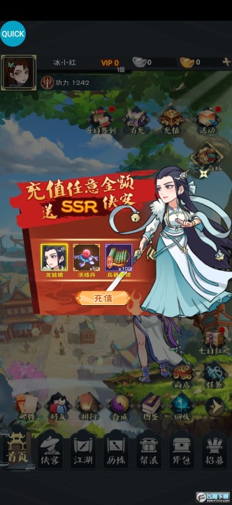 累计充值1000---SSR万能碎片*60,侠客升星石*1000,绝世武学秘籍自选礼包I*6,SSR侠客自选礼盒*3