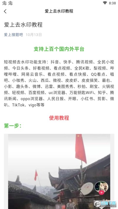 短视频去水印功能支持:抖音、快手、腾讯视频、全民小视频、今日头条、好看视频、看点视频、全民K歌、梨视频、哗哩哗哩、网易云音乐、看点视频、看点快报、QQ看点、唱吧、小咖秀、火山、西瓜、微视、皮皮虾、皮皮搞笑、最右、小影、趣头条、微博、迅雷、美图秀秀、秒拍、刷宝、火锅视频、轻视频、百度视频、uc浏览器、万能钥匙WiFi、知乎、腾讯新闻、oppo浏览器、人民日报、开眼、小红书、剪影、微叭、TikTok、vigo等等