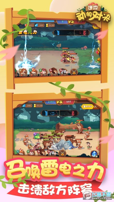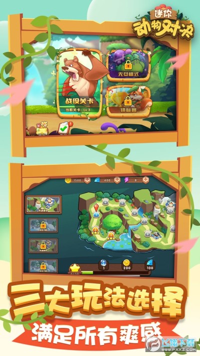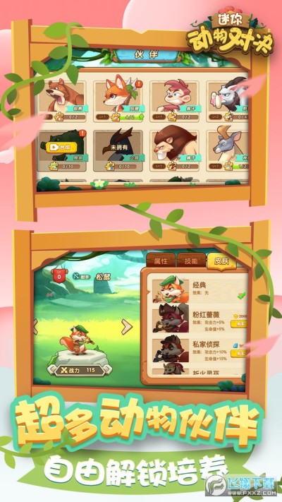 游戏含有多种动物供玩家解锁,玩家可以随心选择喜欢的动物进行属性升级、培养。游戏开始前可以按照喜欢的动物和类别进行合理的阵容搭配。