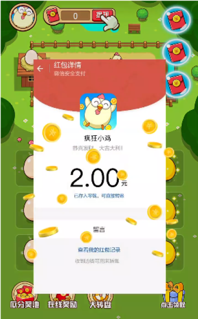 疯狂小鸡,下载APP,看几个广告。提现0.3元,几分钟才到微信零钱!付款商户“白月-奖励”。