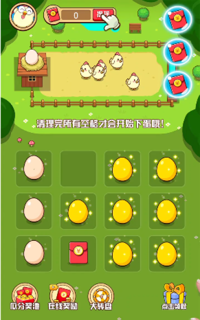 疯狂小鸡游戏是一款最新的休闲养成类赚红包游戏,游戏玩法简单轻松易上手,在这里通过不同的玩法喂养你的小鸡,完成每日红包任务即可赚现金红包奖励,游戏最低0.3元无门槛提现,对游戏感兴趣的话不妨点击下载试试!