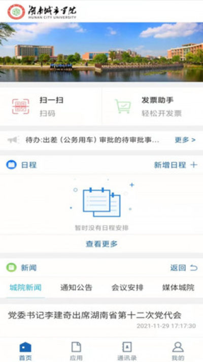 湖南城市学院移动办公系统,湖南城市学院APP是接入学校的网络办公系统,使办公自动化系统的应用摆脱地理空间的约束,实现学校日常工作,通过课表校历、通知公告、会议日程、成绩报告等功能,带给师生不一样的使用体验。