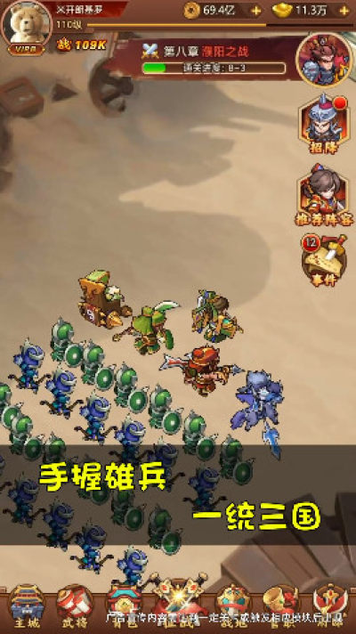 《萌将闹三国安卓版》是一款Q萌风格的策略三国类游戏。这款策略游戏以三国时期为背景,玩家将在游戏中招募更多的武将来进行对决,升级武将,挑战更多的对决,召集更多的人马,还有超多关卡等待着你的挑战,感兴趣的小伙伴们赶紧下载体验吧!