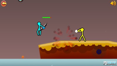 这是一款火柴人题材的格斗类动作手游,游戏采用PK的方式进行战斗,将对方成功击入岩浆中获胜,游戏中有大量的场景,各式不同种类的武器供玩家挑选,分为三种不同的模式。游戏对于操作的要求较高,在PK过程中仅有一个方向控制键,玩家控制人物的前进方向和攻击方向,滑动轮盘到边缘并维持一段时间会触发武器的专属技能,往往能对敌人造成巨额伤害。
