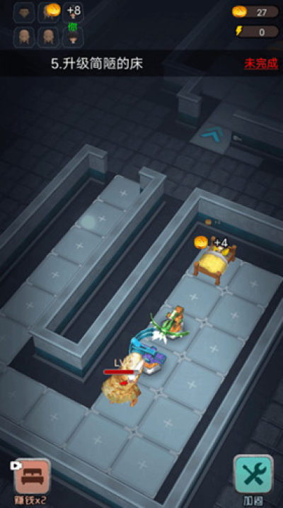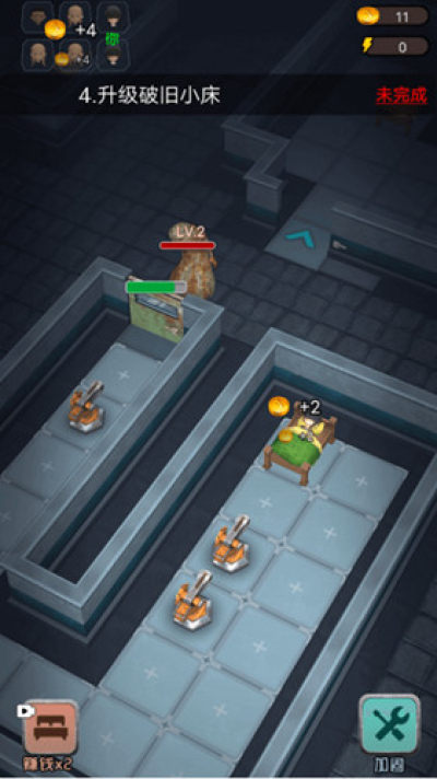 攒钱,把床升到每秒+32时直接把所有炮台拉到二级,造一个一级游戏机,然后升到一级铁门,之后把游戏机升到2级,攒钱把铁门升二级,再拉一个二级游戏机,铁门升到三级,再把床升到每秒+64,接着就把两边的炮台都变成喷射水枪,再造一个二级游戏机,顺便建两三个自动修墙的