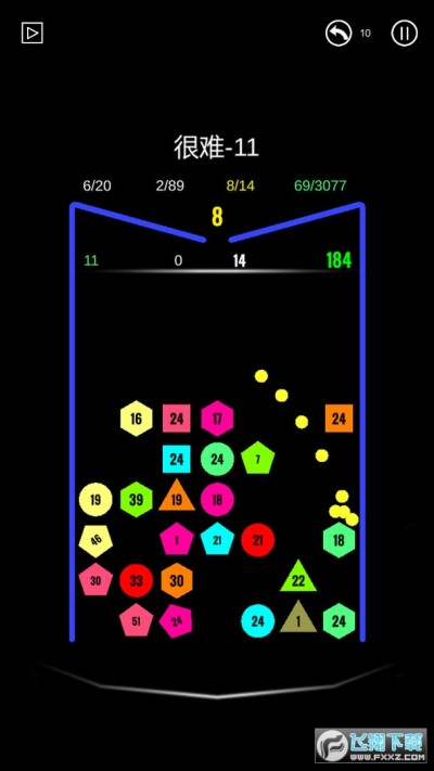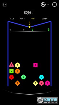 从所有小球发射出去击打砖块,到它们重新返回到发射位置称为一轮。关卡中的砖块上都有一个数字,表示当前砖块的点数。小球击到砖块一次,砖块点数减一。砖块点数减到0时砖块消失。