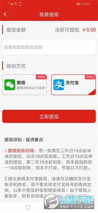 3、猛虎看点首次提现金额最低5元起,15点钱申请当天18点前到账,15点后次日到账,周末、节假日不打款