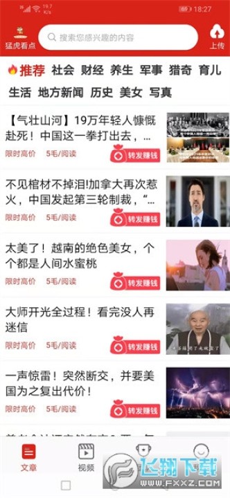 1、猛虎看点转发平台内的文章内容健康而且丰富,有老百姓关心的柴米油盐价格,也有明星八卦,有美食常识,也有养生常识