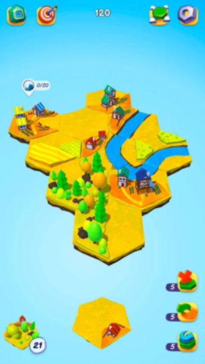 你用一堆六角形开始游戏。将堆栈中的顶部瓷砖逐个放置到板上的任何可用插槽中,必要时旋转它们以获得更好的组合。因此,形成了景观的组和组合,例如森林、城市或水体,您将根据瓷砖的组合程度获得积分奖励。