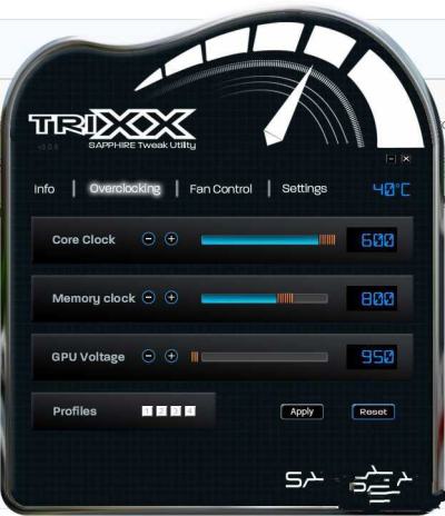 SAPPHIRE_TriXX是一款蓝宝推出的显卡超频软件 ,界面简单明,而且就算在软件里你设置GPU/显存的频率为600/800的话,平常不玩游戏的时候,显卡仍然会降低到最低频率,而玩游戏的时候,又会自动上升到600/800,非常好用的一款软件。