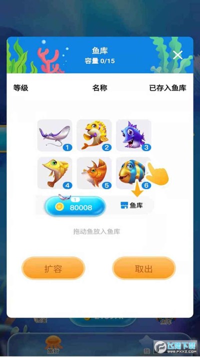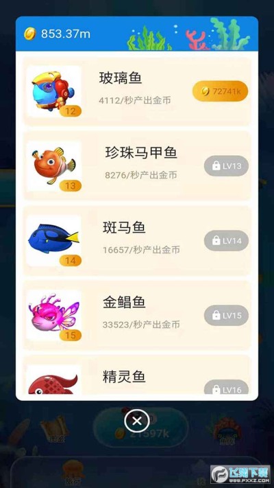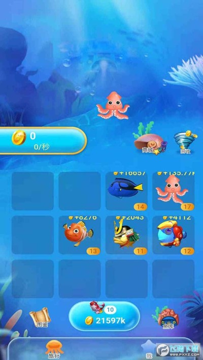 海底寻宝是一个合成类休闲益智的小游戏,2条低等级的鱼可合成高一等级的鱼,合成后的鱼每3秒产出一次金币,等级越高产出的金币越多。合成高等级小鱼,赚取更多金币!