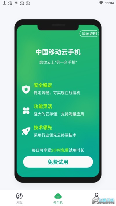 “免费试玩”:打开底部tab“云手机”,点击“免费试用”按钮,领取免费开通时间,领取成功后返回首页。