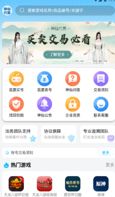 神仙代售app是一款非常专业的游戏服务平台,提供各类游戏账号交易,还可以帮助用户找回游戏账号,非常方便,各种服务也都是非常专业的,可以咨询清楚后下单,提供专业客服可以随时在线解决用户的订单问题,提供更多交易保障,让玩家玩游戏更畅快。