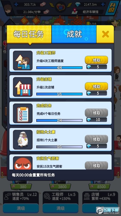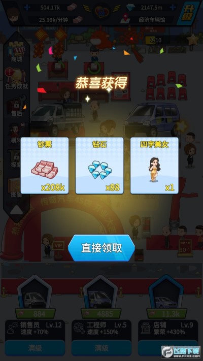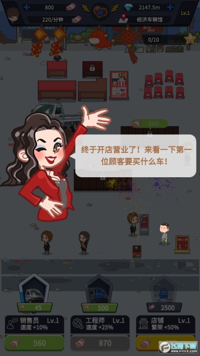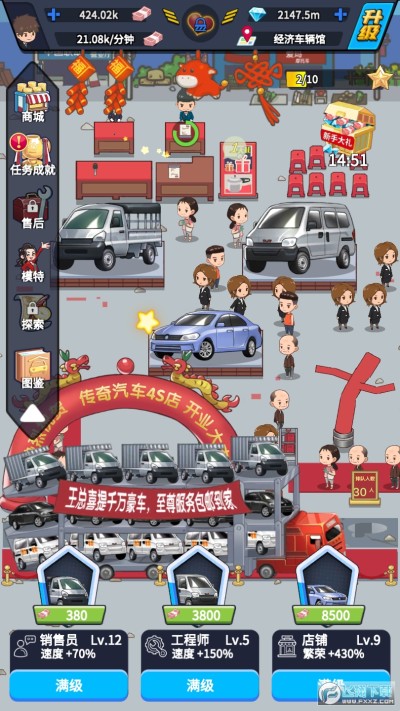 这是一款汽车销售经营+模特收集的经营类游戏,是以汽车公司老板为视角,您将通过解锁升级汽车、解锁升级销售员工程师、做好宣传等操作来吸引更多顾客。不断扩充分店,扩大规模,成为全球汽车业霸主!