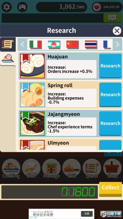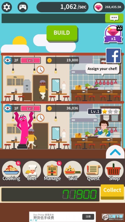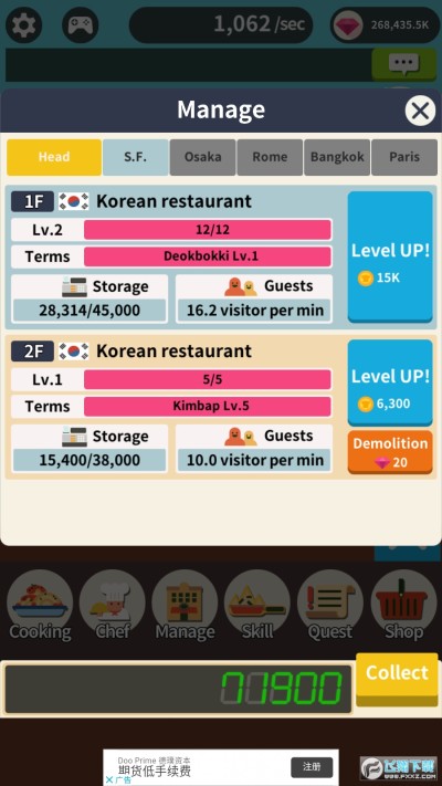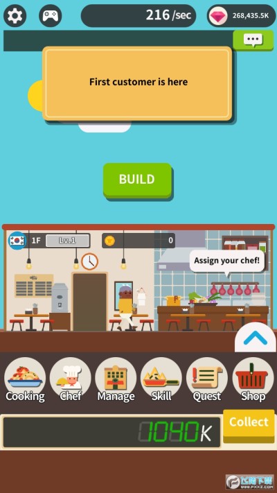 游戏整体可以说结合了放置和模拟经营,两者各占一半,可以看到餐馆实实在在地建起来,还是很有成就感的!开自己的主题餐厅,把每一层建成不同的风格。选择您最喜爱的厨师并洽谈薪水。不同的厨师有不同的技能和专业!挑选你的梦之队!