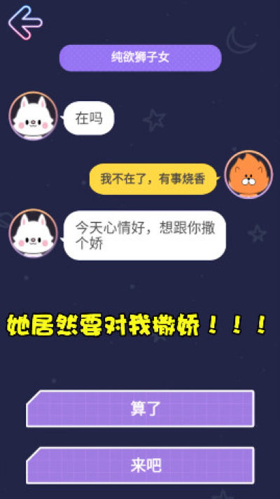 《星座狗联盟游戏手机版》是一款将十二星座人物特性还原,模拟了真实对话的手机闯关游戏。这款游戏不仅模拟了场景、还模拟了对话,玩家在游戏中可以通过对该星座的了解,来分析回应什么的话术,回应对了即可解锁下一关卡的挑战!游戏的玩法十足趣味,感兴趣的赶紧下载体验吧!