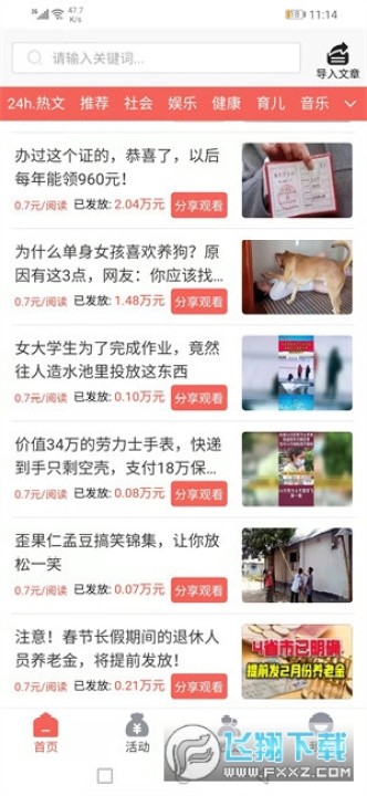 1、点击海鸥宝app内“转发”频道任选一篇文章转发到微信群或者朋友圈,只要有人点击阅读你就能获得现金奖励,阅读的人数越多,你的收益也就越高