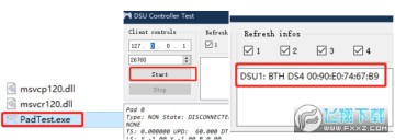 打开解压的工具文件夹里面的体感测试文件夹,右键padtest.exe以管理员身份运行,然后点击start,接着点击两次DSU1这串地址,此时晃动手柄,就可以看到右侧的手柄在跟着晃动,代表体感已经模拟成功