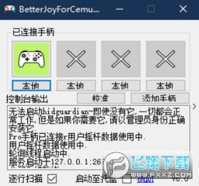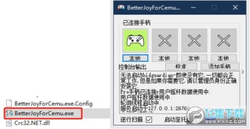 6:右键该文件夹下的betterjoyforcemu.exe,以管理员身份运行,打开后如下图所示,如果杀毒软件询问是否打开,请务必允许运行,然后手柄平放在桌面上,然后依次点击绿色手柄下的“本地”,“校准”,提示校准完成即可,切记不要关闭该软件,保持后台运行,并且以后运行cemu前,请务必先打开这个软件,至此,已经完成了体感模拟的设置。