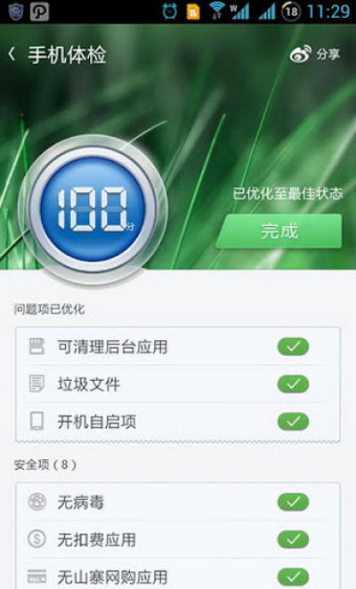 系统全面地检查手机,快速定位手机问题,恢复手机至最佳状态。包括快速病毒扫描、恶意广告插件扫描、手机内存占用、安全服务扫描、缓存垃圾文件扫描、系统垃圾文件扫描、开机自启项扫描达七项检查,确保手机健康。