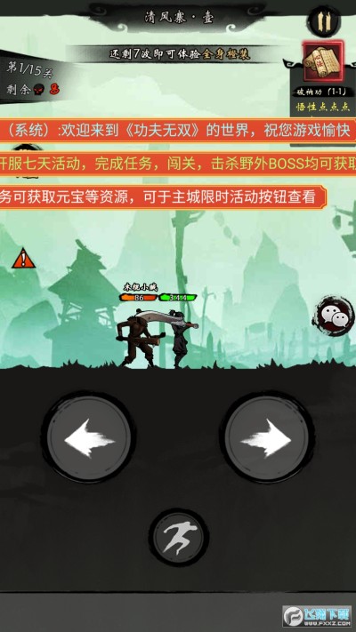功夫无双手游是一款国风水墨武侠闯关类游戏,游戏中玩家可以操控你的人物角色开启冒险,在这里点击即可进行战斗,不断闯关即可获取游戏奖励,每日登陆即可领取金币奖励,免费即可兑换商城各种物品材料。对游戏感兴趣的话不妨点击下载试试!