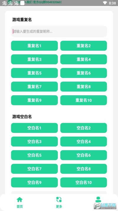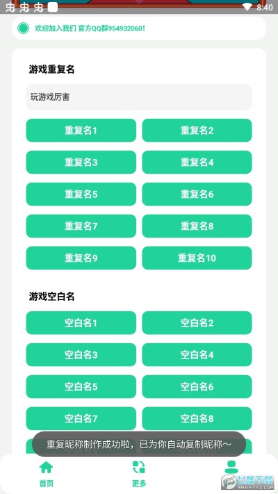 游戏重复名生成app是一款游戏重复名字生成器安卓免费软件,软件帮助用户一键生成重复名字代码,可以自由组合使用,不用担心游戏名字被占用,软件操作简单便捷,无需手动复制自动复制生成的重复昵称,对软件感兴趣的话不妨点击下载试试!
