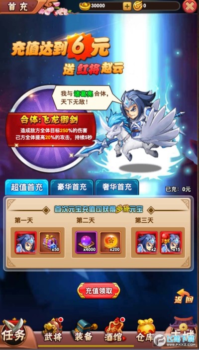 1、玩过之前的版本,说说前期的玩法吧。1、不氪金或者微氪的话,前期培养吕布,推图升级才是王道,建议搞个永久卡,月卡等送就行。2、328开局,极限培养赵云就行,全部资源都给他,推图和爬塔速度会很快。
