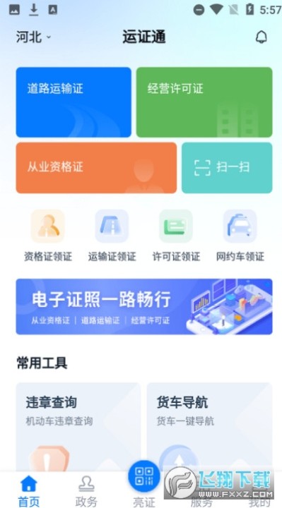首页点击正下方“亮证”,快捷展示证照二维码,也可切换不同证照类型。