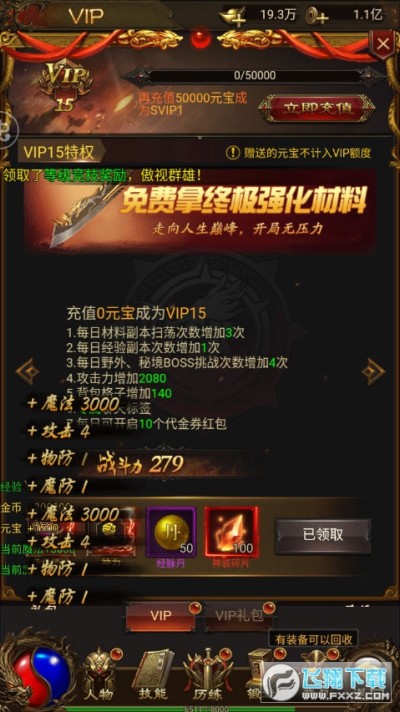 进入游戏内即可获得:vip15,元宝*138888;