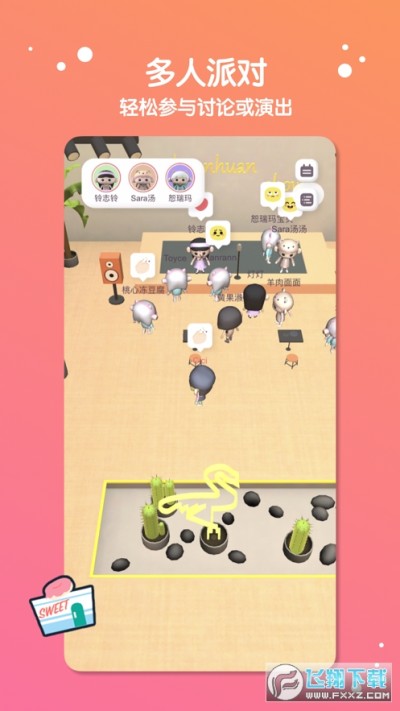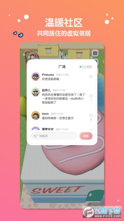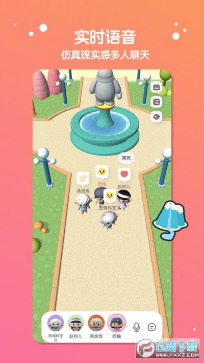一款非常酷的社交软件,用虚拟的形象来和其它陌生的居民进行交流,只需要彼此靠近,就可以实时语音或者打字问候,可以说是社恐福音,你可以在岛的边缘看海散步,在冰淇淋雪山下看可爱小鸭游来游去,可以在咖啡厅里抢麦一展歌喉,也能在猫喷泉广场和其他人聊天八卦,甚至还能叫上你的好朋友们一起来场紧张刺激的3V3足球赛。后续还会有更多的建筑功能,居民朋友一起保持期待!