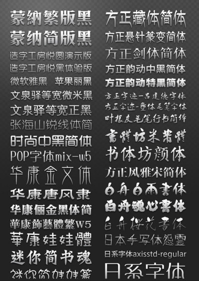 这里给大家带来的是以套非常好用的平面设计字体包,其中包含各种字体,超世纪的、方正的、华康,甚至还有日文体,总之还算比较齐全的,有需要的朋友可以免费下载,具体效果参照下面的软件截图。