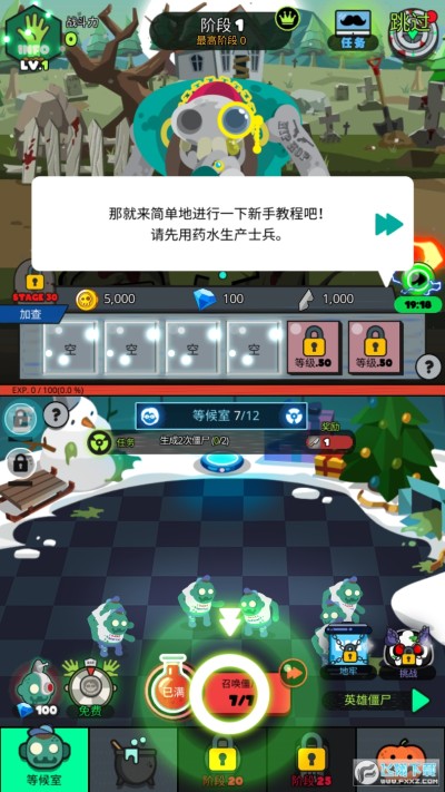 僵尸们都有自己独特的技能,通过合成可以解锁更多高等级僵尸。战斗过程中会出现各种怪物阻挡去路,僵尸们需要打败它们才能通过。你可以通过升级僵尸,为僵尸们装备武器,来提升僵尸的战斗力。通关当前章节后,即可解锁下一章节的故事,僵尸们能不能打败邪恶的比克,就靠你啦!