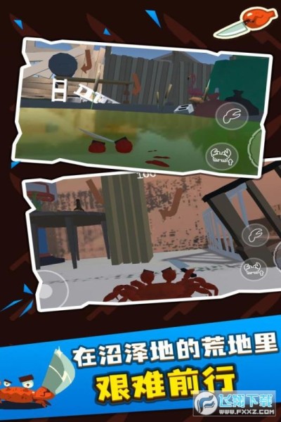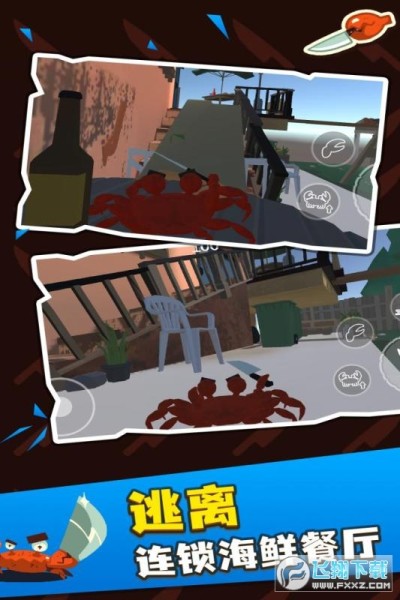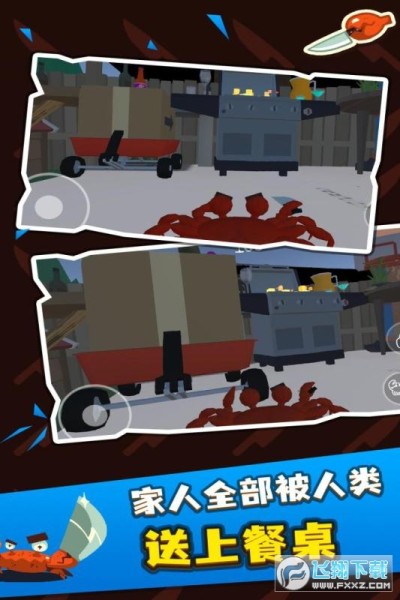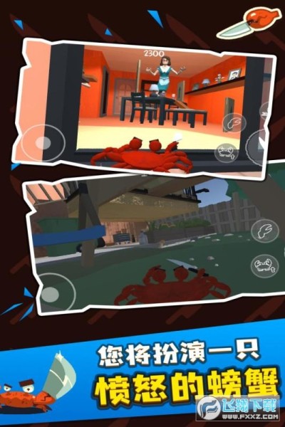 游戏中玩家将控制一只红色的螃蟹冒险,可以滑动按钮控制螃蟹移动,点击钳子和刀子可以让螃蟹攻击前方的物体,粉碎座椅等各种东西,连续破坏能够获得更多的分数,真实模拟螃蟹的移动方式,灵活运用大钳子与餐刀,避开企图消灭你的人类,夸张的物理效果,带给你独特的视觉体验。