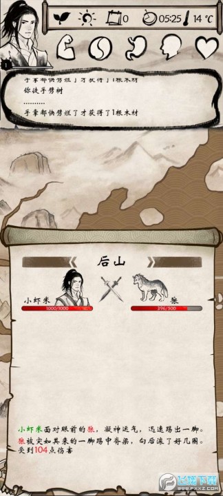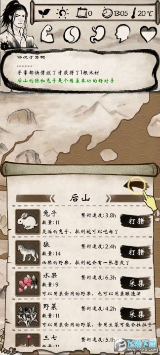 继续去后山,资源都采了,都运回家,做酿酒器、酒桌,做两个酒先喝了,送的那块烤肉吃了,灶台做了,装备上送的武功和内功、武器、衣服,去后山杀兔子,打到剩下1只,开始杀狼