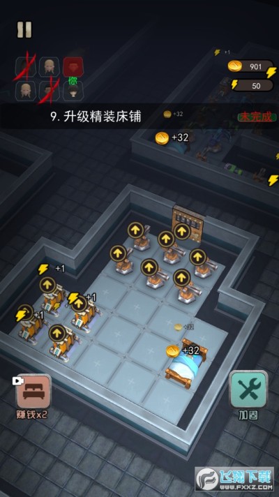 1、躺在床上的人可以产生金币,这将带来最丰富的游戏性,金币可以用来建造防御装备;