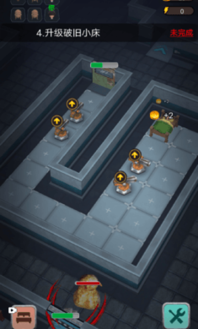 攒钱,把床升到每秒+32时直接把所有炮台拉到二级,造一个一级游戏机,然后升到一级铁门,之后把游戏机升到2级,攒钱把铁门升二级,再拉一个二级游戏机,铁门升到三级,再把床升到每秒+64,接着就把两边的炮台都变成喷射水枪,再造一个二级游戏机,顺便建两三个自动修墙的
