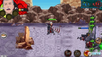 火影战记中在游戏中两边派出小兵,消灭小兵和英雄都可获得金币,金币可用与购买屏幕左方的食物从而恢复血量。