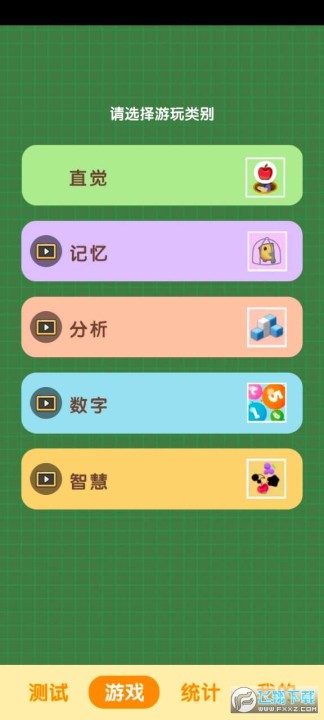 测试:针对直觉、智慧、数字、记忆、分析共5个项目分别进行测试。