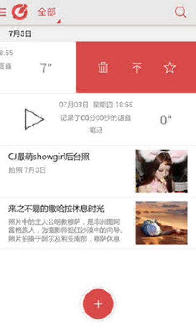 右划单条笔记,可以直接置顶、加星或删除,整页向右划动可进入查看笔记本;