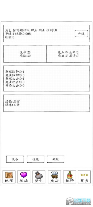 首先是剑士,开局生命25魔法30(使用技能消耗的魔法值)属性是物理防御0-1。物理攻击0-1,其它都是0我就不写了。