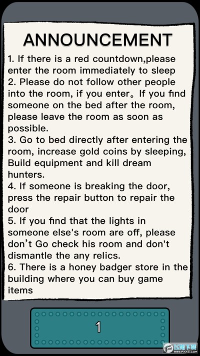 躺在床上,增加你的经济,地板是你建立战斗防御结构的舞台。 升级房间内的门以抵抗凶猛的幽灵的攻击,否则如果他进来你就会被杀死。 别忘了花钱买一张更好的床,让自己睡得更舒服。 那么你能在鬼敲门声中安然入睡吗? 所以快来加入我们,与其他室友一起对抗邪恶。 猎杀宿舍等着你!