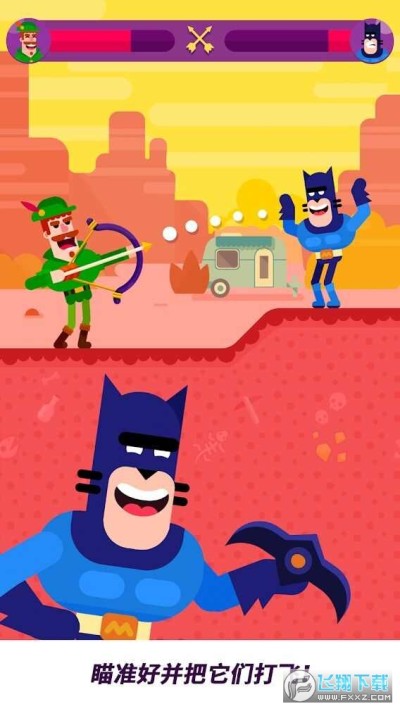 冷血射手有美式幽默诙谐风格的卡通画面,调整成合适的角度以抛物线形式飞出,击中你的对手,考验玩家的物理思维技巧。冷血射手破解版敏捷的操作,物理的特性,选择力度与抛出方向,命中敌人,将对手快准狠的消灭,在他伤害你之前抢先解决掉他。冷血射手破解版有多角色可以选择,并且冷血射手破解版每位角色都有各自擅长的攻击方式和武器。冷血射手破解版游戏在互射模式中胜利到一定的场次,还能解锁狩猎野鸭、射苹果等游戏玩法。