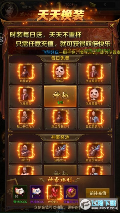 多日累充10000元:神级火舞礼包*1,兽神契约*2,心法残片*1999,命魂晶石*999