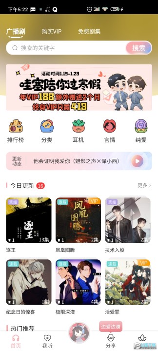 哇塞FM广播剧app是一款专门为影视爱好者量身定制的影视播放软件。在这里,拥有海量高清影视资源,你输入关键字,就可以搜索自己想要的内容。所有资源都是免费的,杜绝任何广告插入,为你提供一个清爽的观影环境。除此之外,这款软件还支持高清蓝光播放,让你享受更高清的体验。整合全网各类影视资源,任你免费看,每日还会为你推荐热门电影,让你远离片荒。
